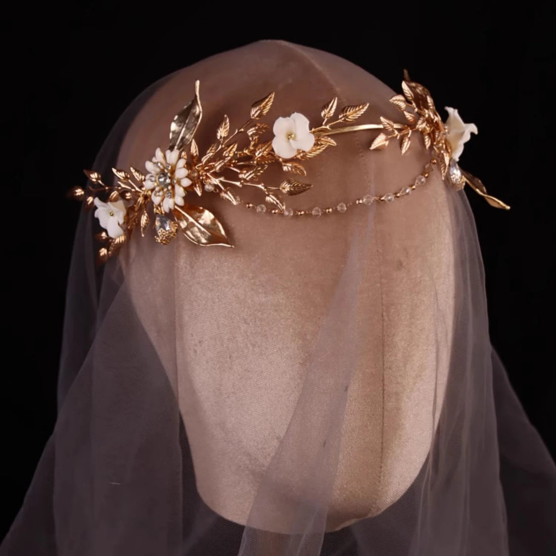 Wedding Hair Accessories Porcelain Flower Headband Tiara Vintage Gold Color Headpiece Crown For Brides Hairbands Bridal Jewelry