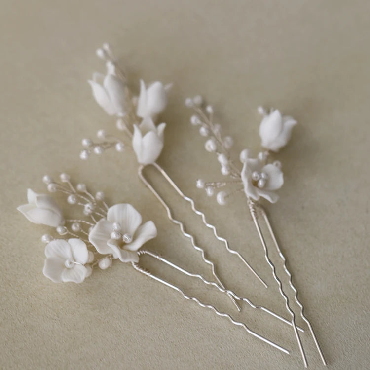 Bridal Jewelry Porcelain Flower Hairpins Silver Color Hair Pin Clip For Brides Bridesmaids Women Head Pieces Wedding Accessories