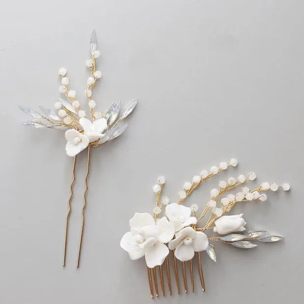 Porcelain Flower Hair Comb Pin Clip Leaf Head Piece For Brides Bridesmaids Crystal Hairpins Wedding Accessories Bridal Jewelry