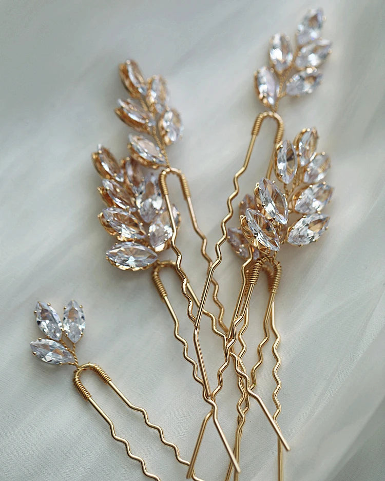 Bridal Jewelry Zircon Crystal Hair Pins Clips Leaf Hairpins For Brides Women Vintage Gold Color Head Pieces Wedding Accessories