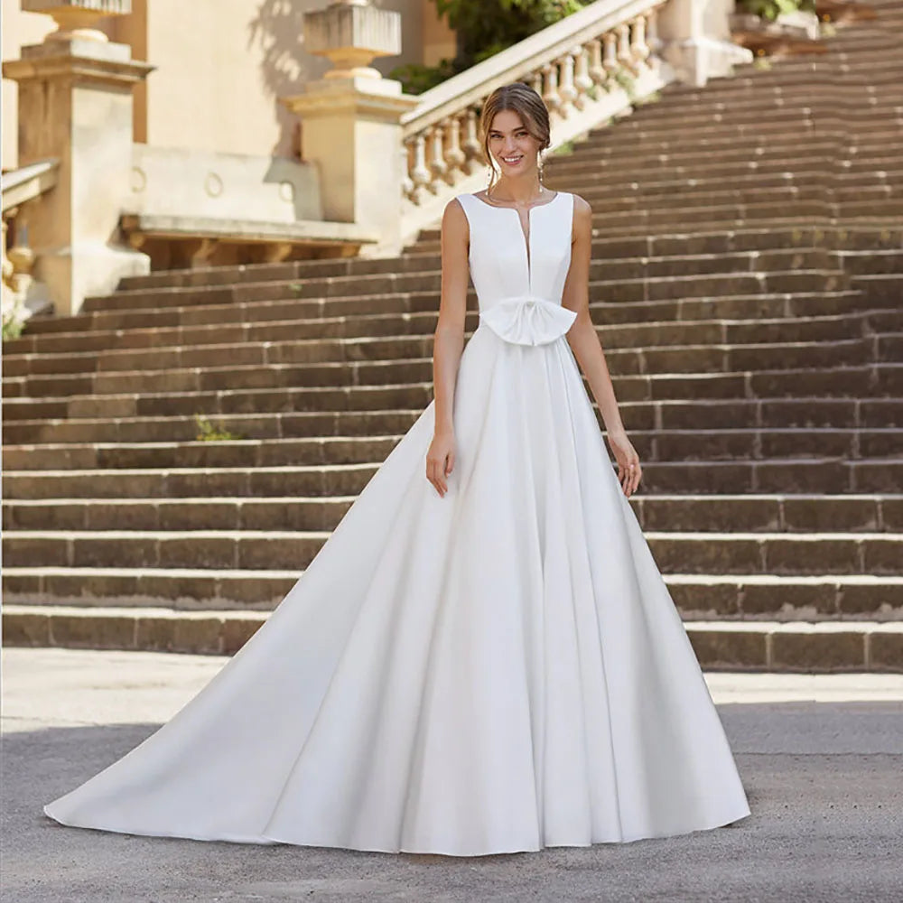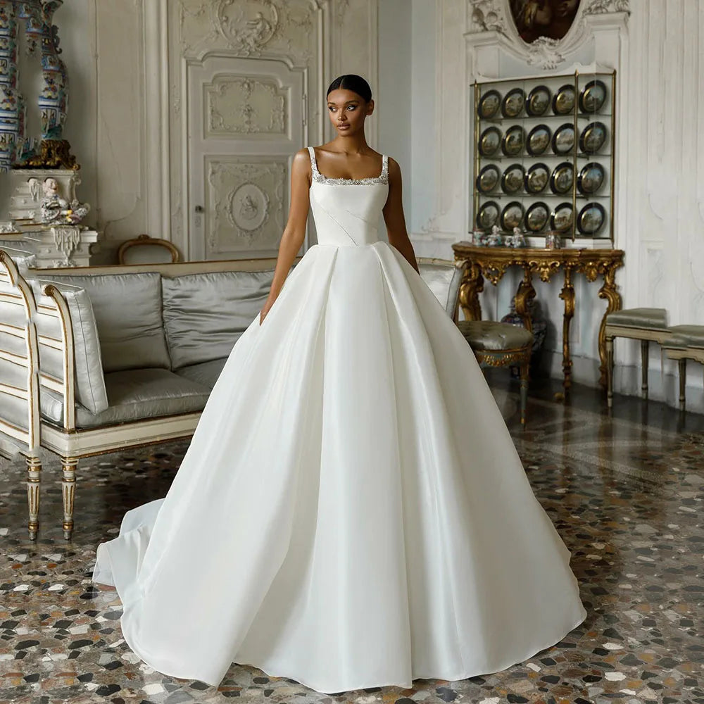 2025 Satin Wedding Dresses Square Neck Backless Elegant Bridal Dress A Line Sleeveless Luxury Long Bride Dress Customized