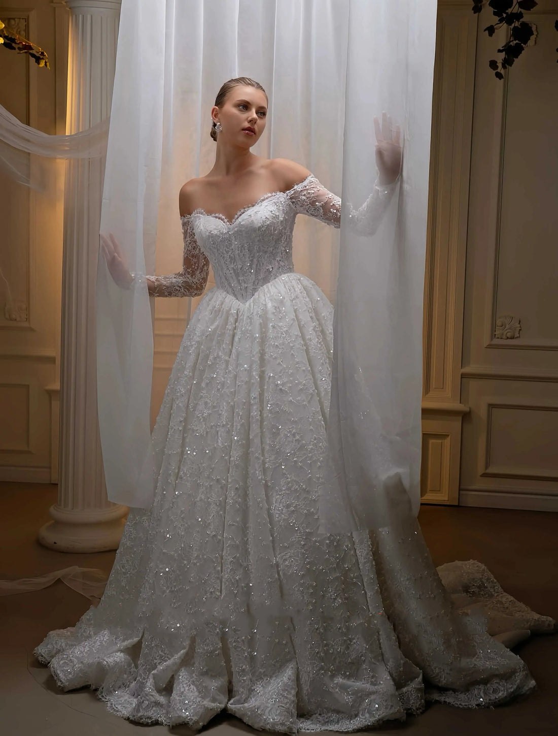 Customized Luxury Lace Wedding Dresses Off Shoulder Long sleeves Ball Gown Floor Length Bridal Gown Vestidos De Novia