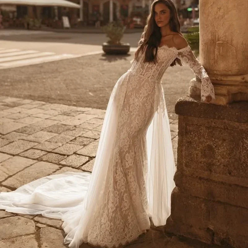 Customized ivory white Long sleeves Wedding Dresses Off Shoulder Lace applique Detachable Tail Bridal Gowns Vestido De Novia