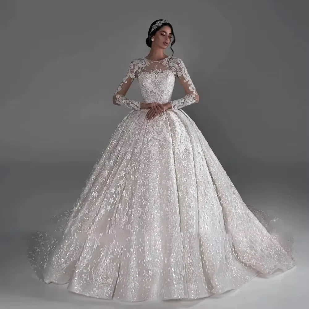 Customized Luxury Lace Appliques Wedding Dresses O-Neck Long Sleeve Ball Gown Vestidos De Novia Gorgeous Robe Mariée Dress