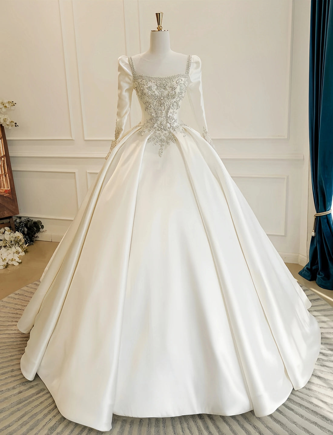 Customized Long Sleeve Wedding Dress Satin Beading Appliques Scoop Elegant Princess Ball Gown Wedding Gown Vestidos De Novia