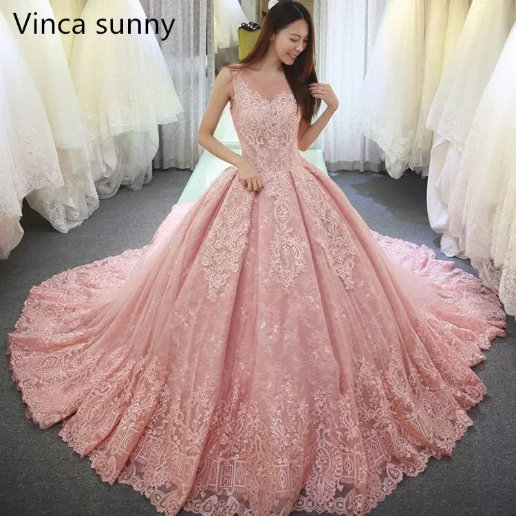 customized Pink Wedding Dresses Princess Sleeveless lace applique Bridal dress Long Tail Backles luxury Vestidos De Noiva