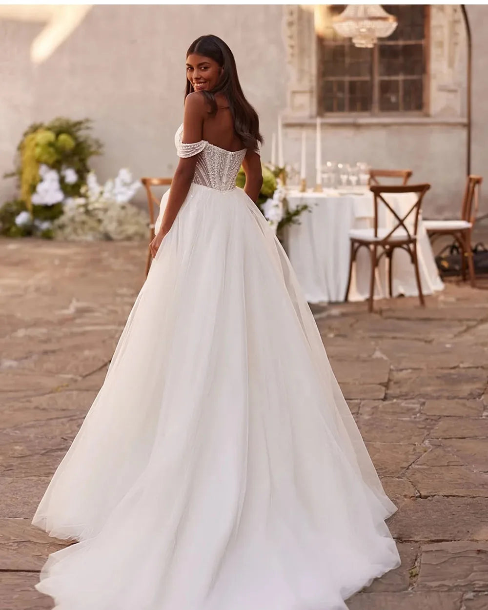 Bohemian A line Wedding Dress Princess Backless Boho High Slit Bridal Gown Off Shoulder Lace Tulle Brides Dress Customized
