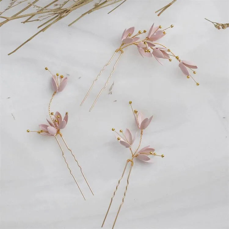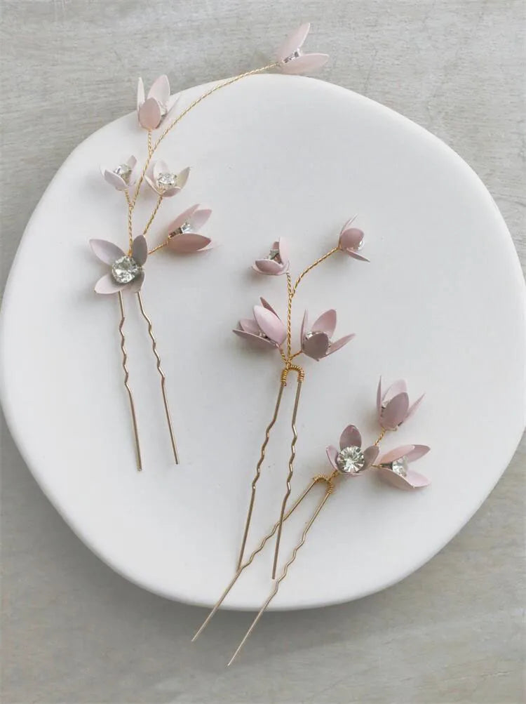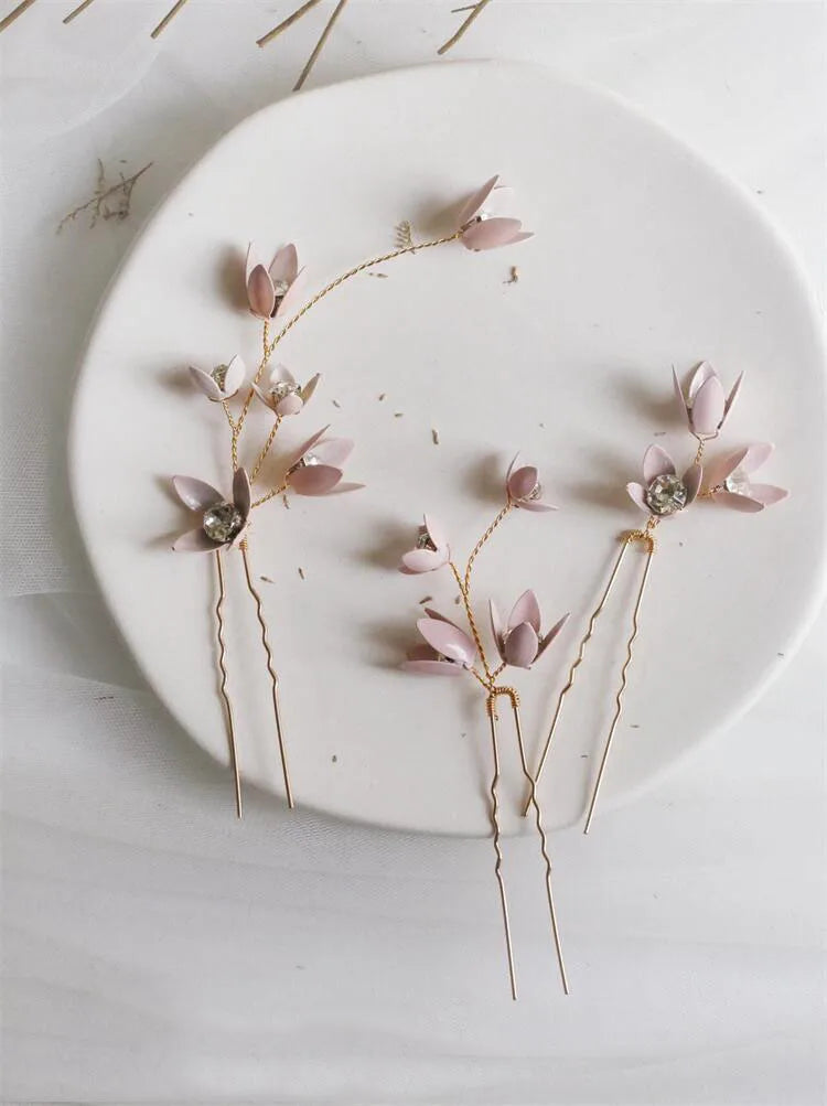 Bridal Accessories Crystal Rhinestones Headpieces Hairpins Pink Flower Hair Pins Clip For Women Brides Headdress Wedding Jewelry