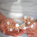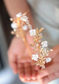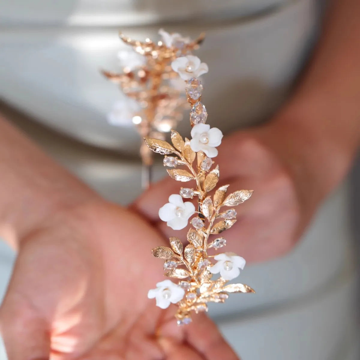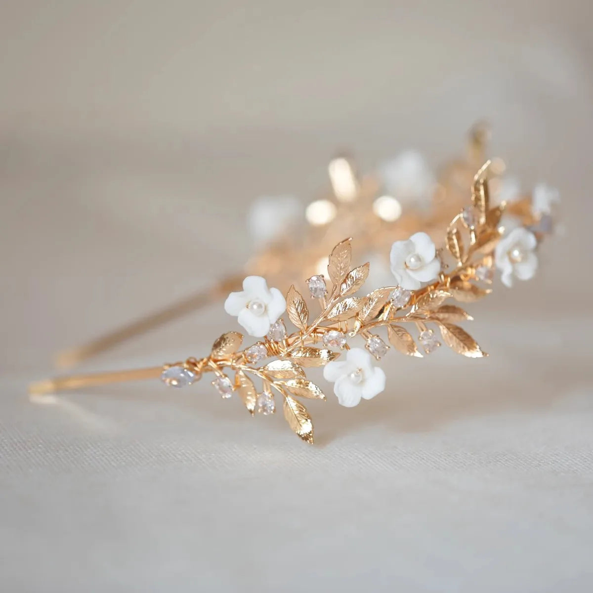 Bridal Hair Jewelry Porcelain Flower Headband Tiara Gold Color Leaf Headpiece For Brides Rhinestones Crown Wedding Accessories