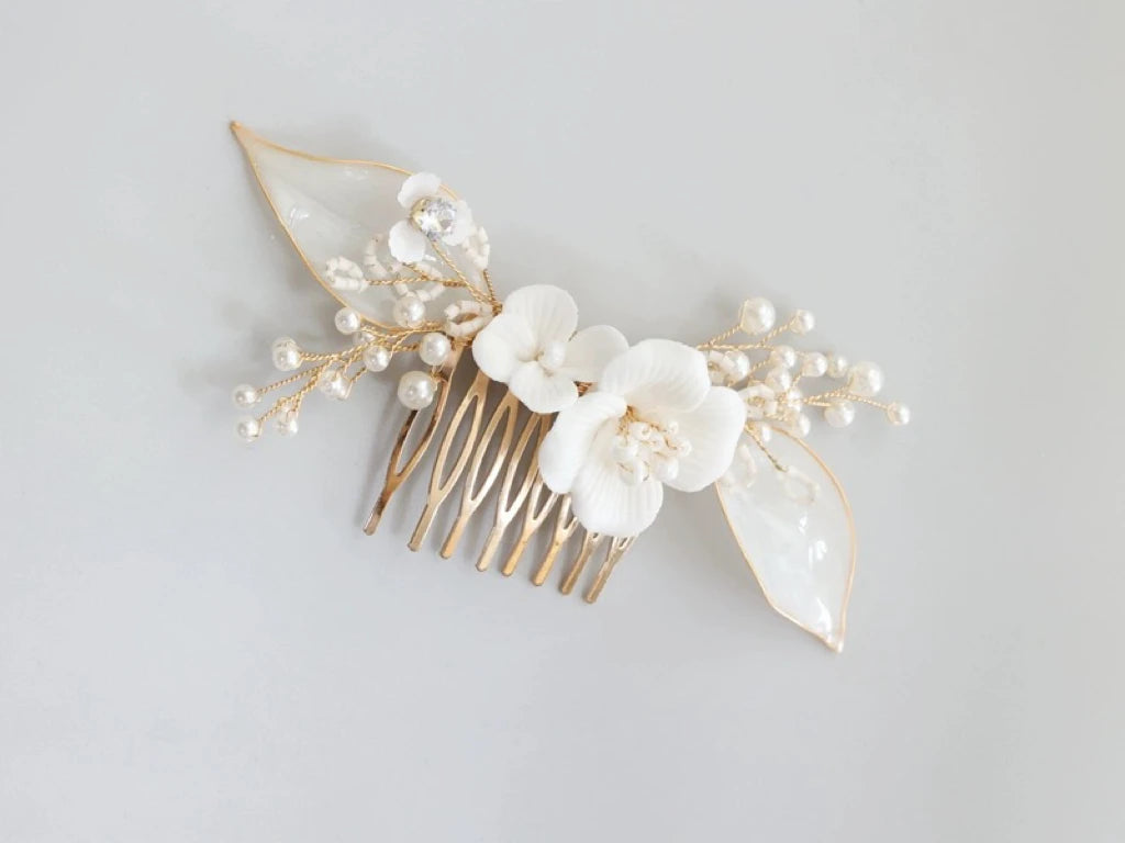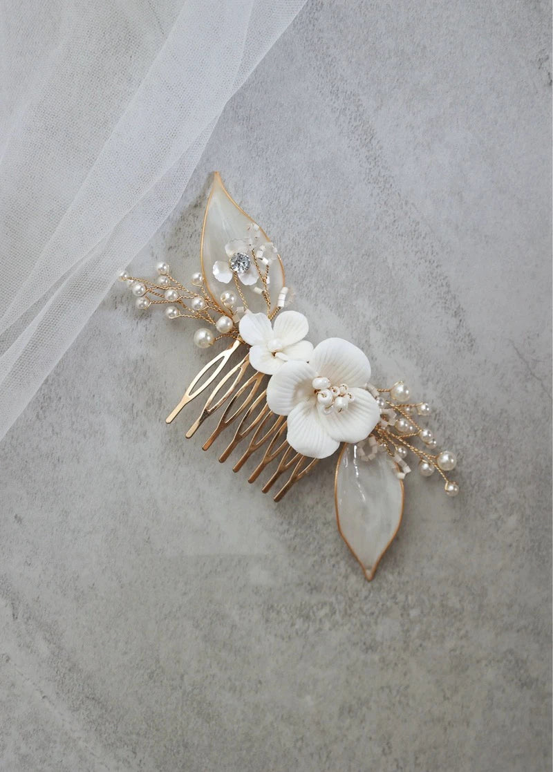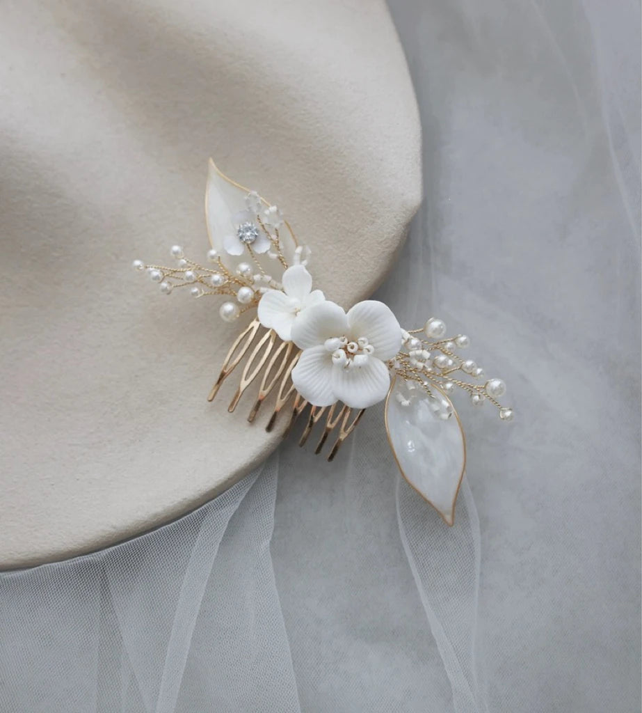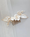Bridal Jewelry Porcelain Flower Hairpin Gold Color Head Piece For Bridesmaids Bride Pearl Hair Comb Pin Clip Wedding Accessories