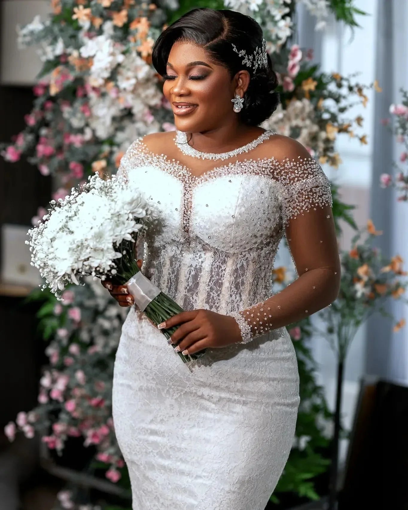 Customized African Aso Ebi Luxurious White Mermaid Wedding Dress Beaded Lace Marriage Full Sleeves Vintage Elegant Bridal Gowns