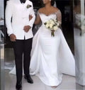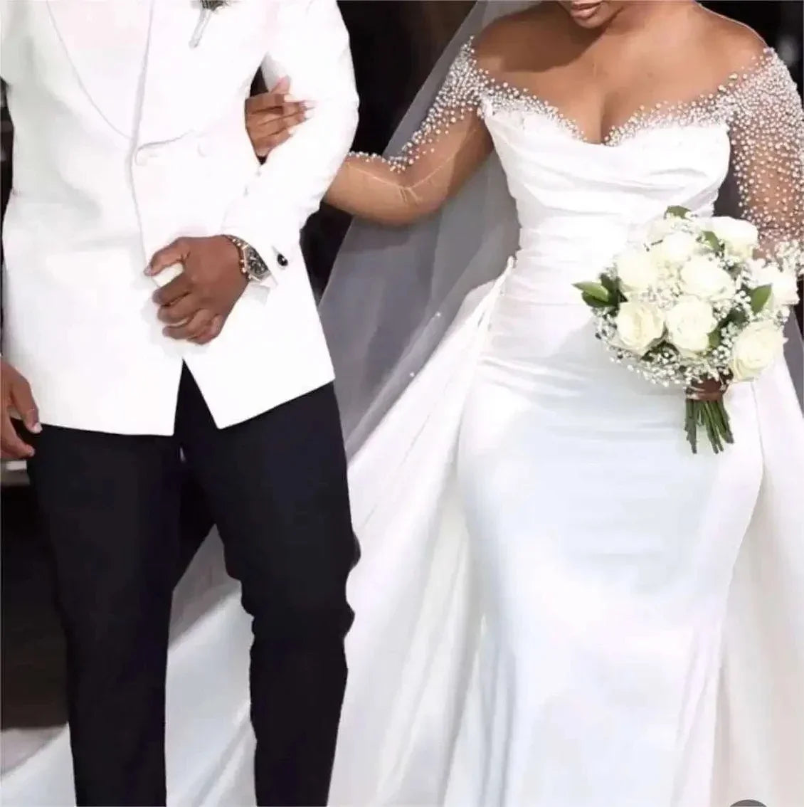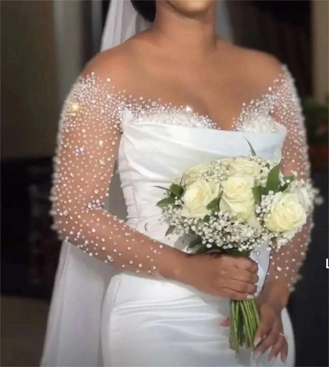 Customized African Wedding Dress Detachable Train Sheer Neck Long Sleeves Handwork Beads Satin Bride Gowns vestidos de novia