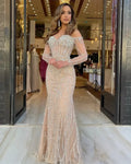 Customized Champagne Off Shoulder Mermaid Evening Dresses Dubai Beading Formal Party Gowns Pleats Long Sleeves Prom Dresses