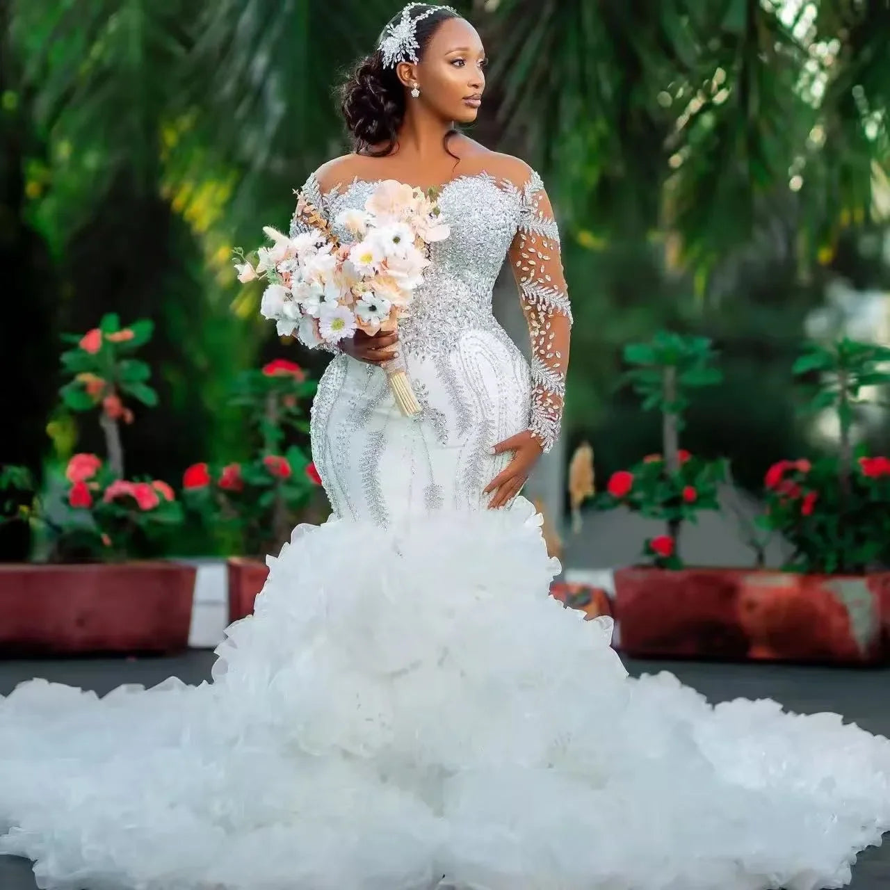 Customized Crystals Rhinestones African Mermaid Wedding Dress Long Sleeves Ruffles Bridal Gowns Garden Vestido De Novia