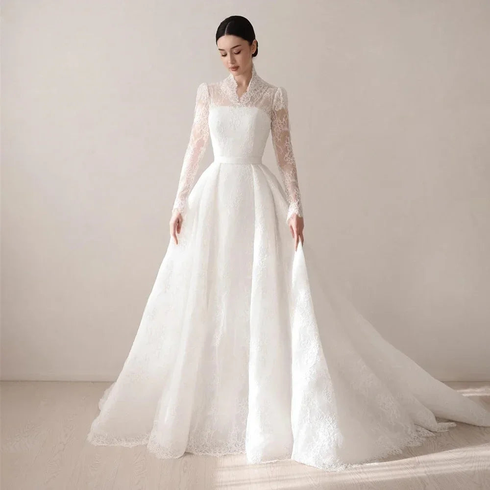 Customized Elegant Dubai V Neck Full Lace Wedding Dresses Long Sleeves A Line Saudi Bridal Dress for Brides Vestido de noiva