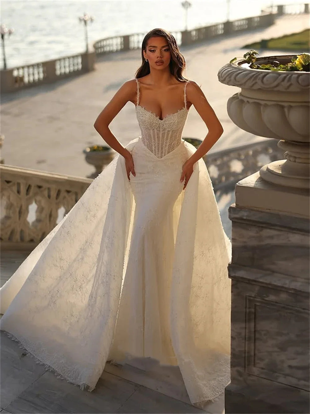 Customized Illusion Lace Corset Wedding Dress 2025 Spaghetti Straps Lace Beaded Bride Dresses Detachable Train Vestidos De Novia
