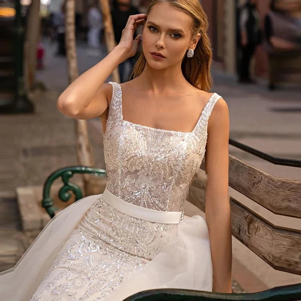 Customized Luxury Exquisite Detachable 2 In 1 Mermaid Wedding Dress Elegant Square Collar Sleeveless Sequined Bridal Gowns