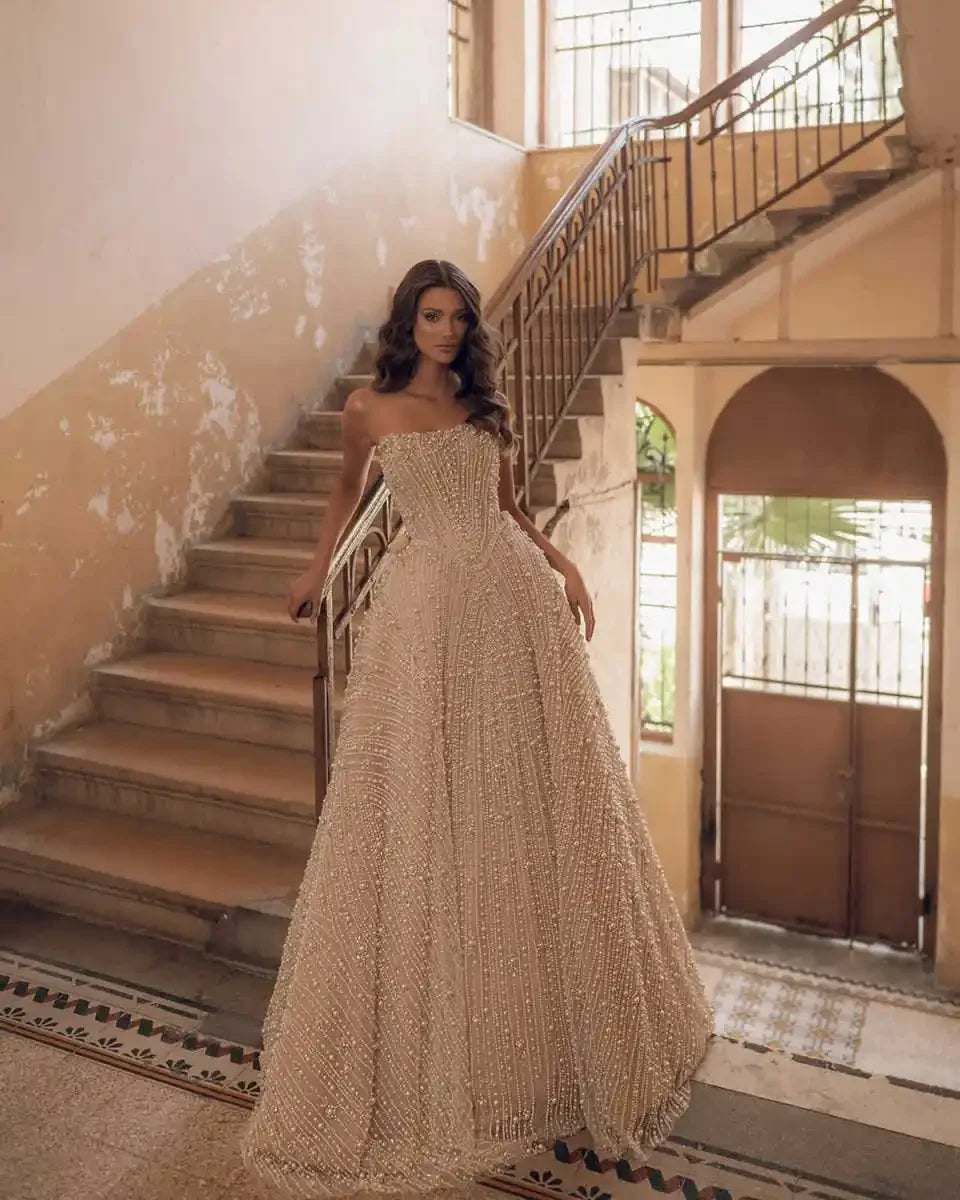 Customized Luxury Exquisite Strapless A Line Wedding Dress Beaded Lace Bridal Dress Beaded Pearls Sweep Train vestidos de novia