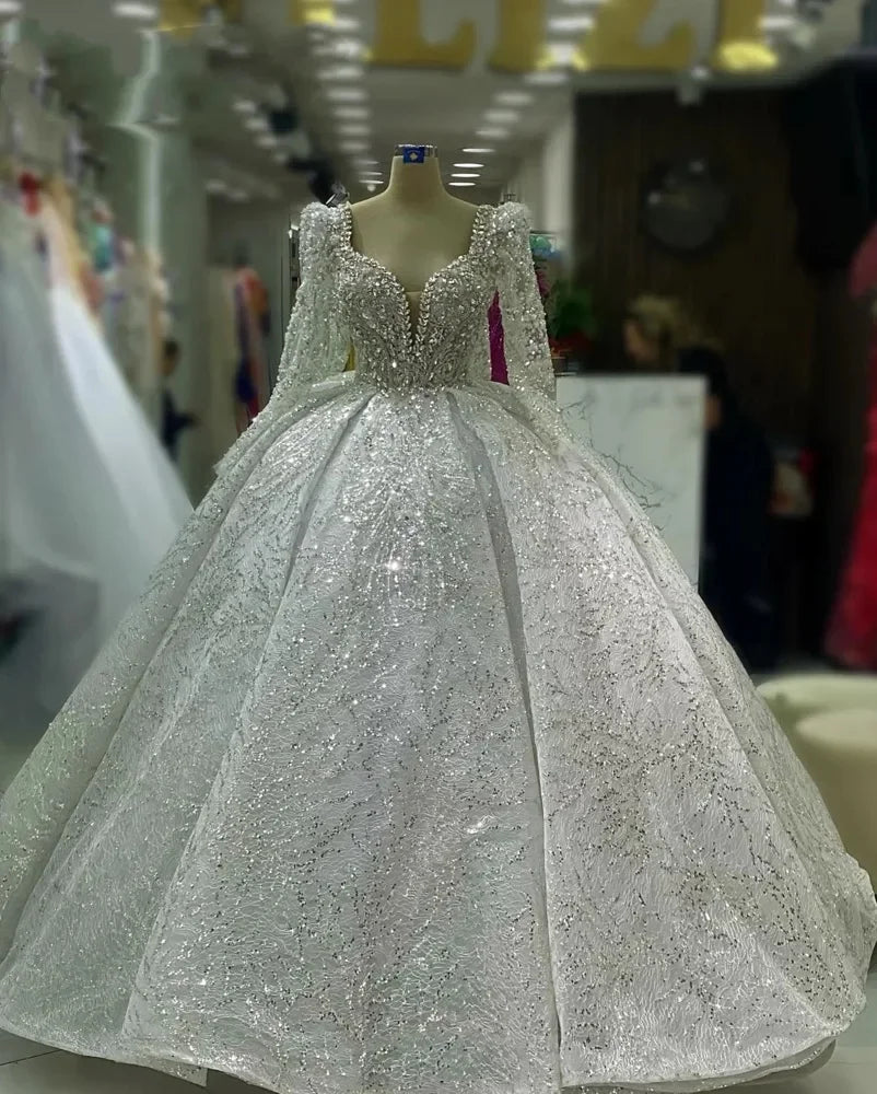 Customized Luxury Lace Beaded Crystals Wedding Dresses Long Sleeve Muslim Bridal Dresses Robes Ball Gown Vestidos de novia