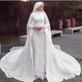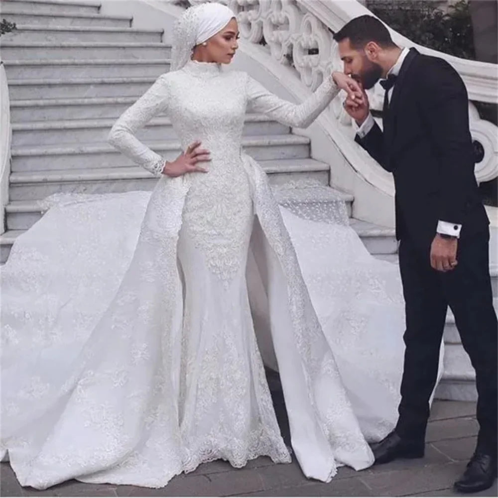 Customized Muslim Mermaid Wedding Dress With Detachable Train Applique Lace Bridal Dress High Neck Long Sleeve vestidos de novia