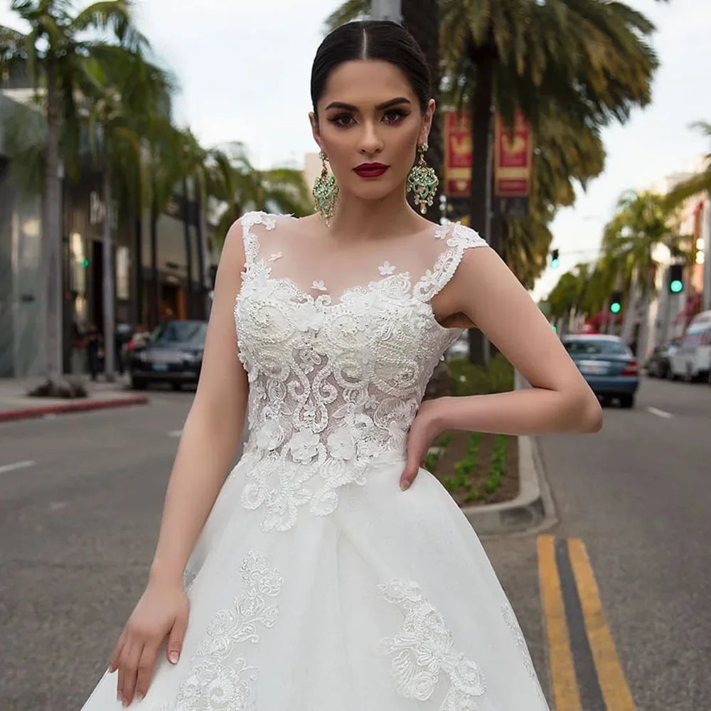 Customized Pearls Appliques Flowers Gorgeous Ball Gown Wedding Dresses With Chapel Train Casamento Sexy Bridal Dress