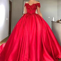 customized Red Ball Gown V Neck Prom Dresses Off Shoulder Lace Appliques Beaded Satin Corset Lace Up Plus size Evening Dresses