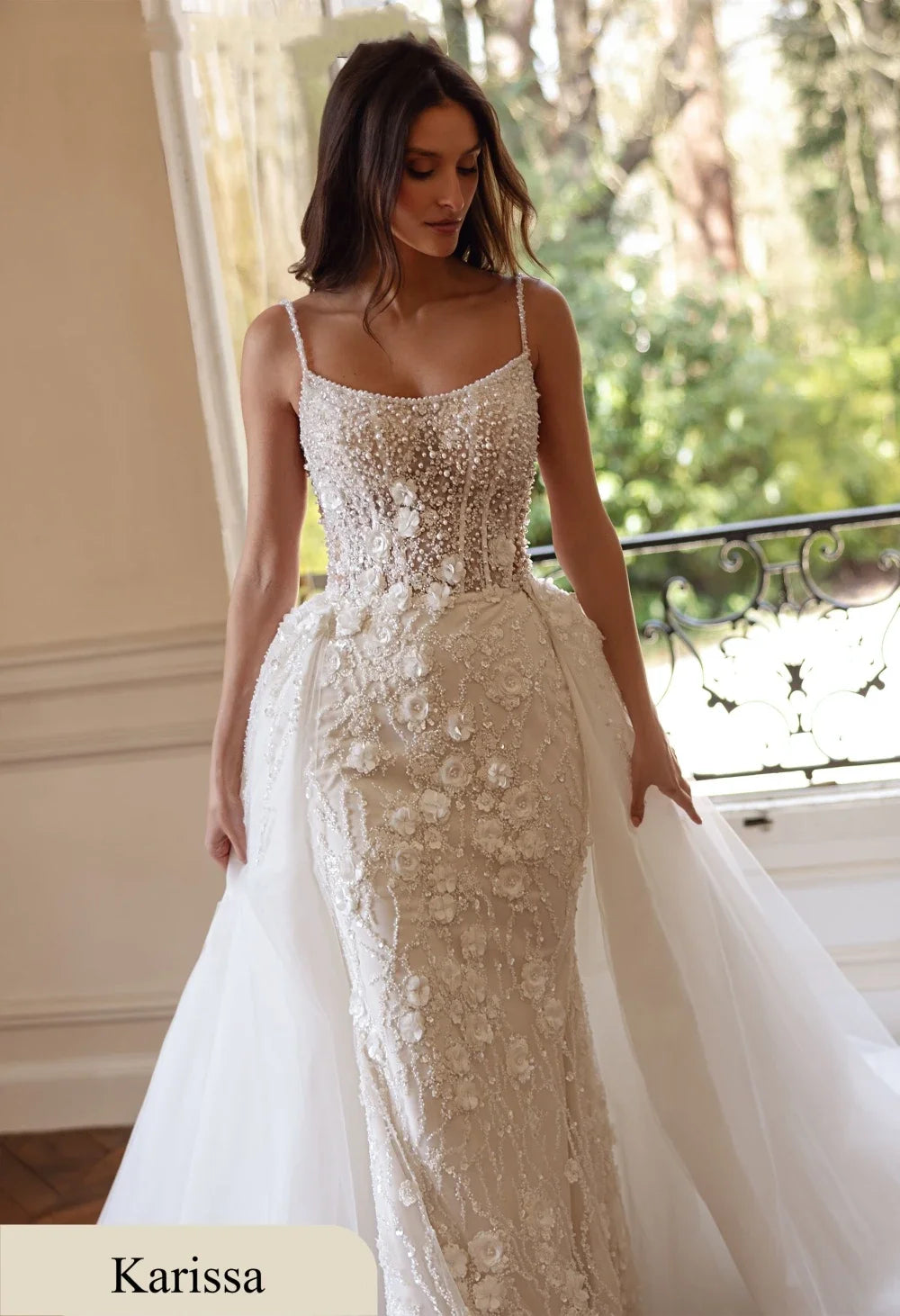 Customized Romantic Beading Spaghetti Straps Mermaid Wedding Dress Detachable Train Applique Lace Bridal Gown Vestidos de novia