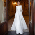 customized Satin Wedding Dresses O-neck White robe de mariée Long Sleeve A Line Bridal Dresses Vestido de Novia With pocket