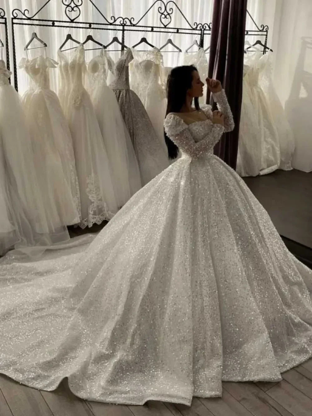 Customized Scoop Beads Sequins Wedding Dress Long Sleeves Ballgown Puffy Robe De Mariée Bridal Gowns Vestidos De Novia