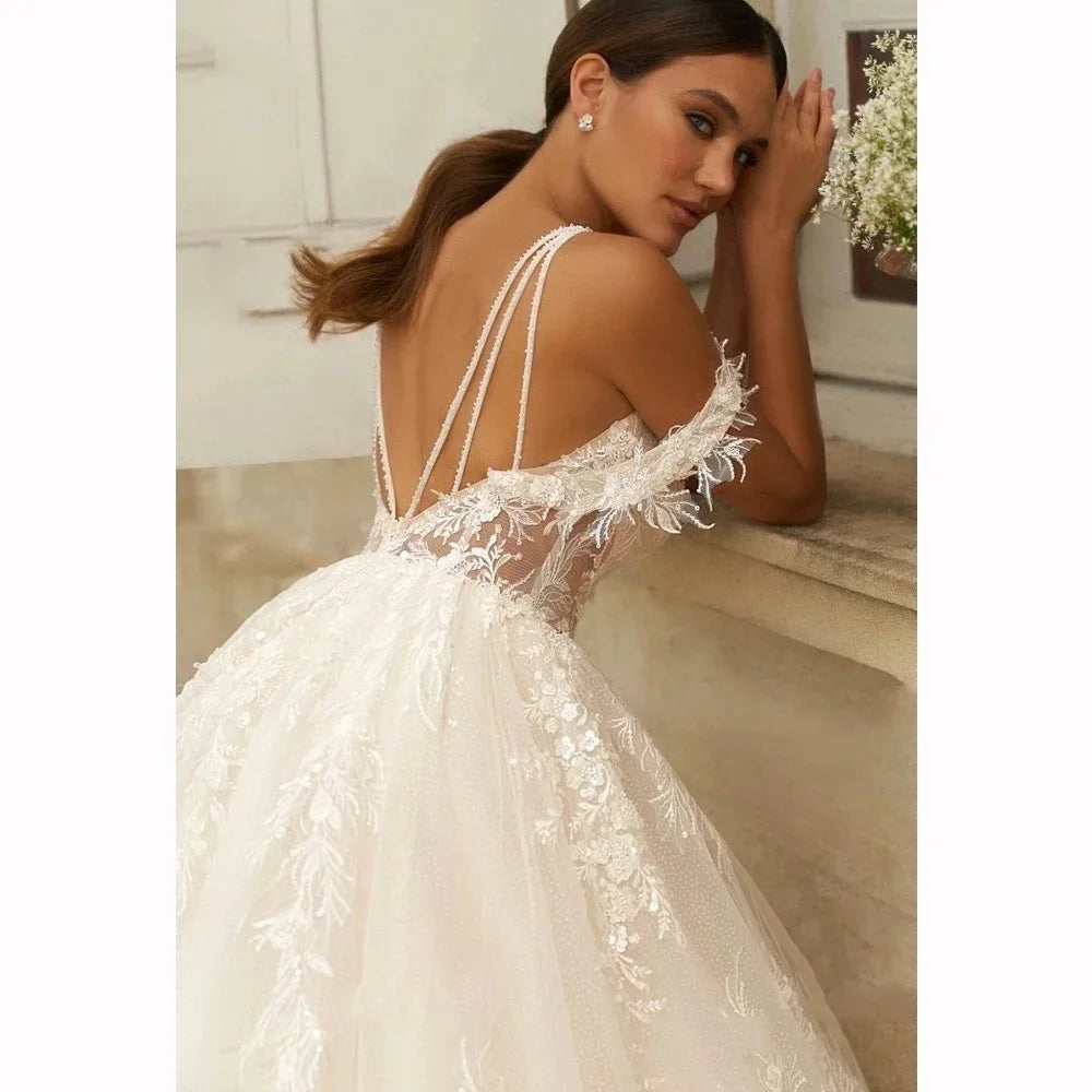Customized V Neck Wedding Dress Backless Lace Appliques A-Line Shiny Off Shoulder Bride Gown Princess Vestido de Noiva 2025