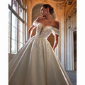 Customized White V Neck Pearls Ball Gown Wedding Dress Off The Shoulder Simple Satin Back Zipper Bridal Gown Vestido De Novia