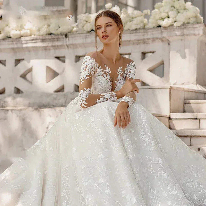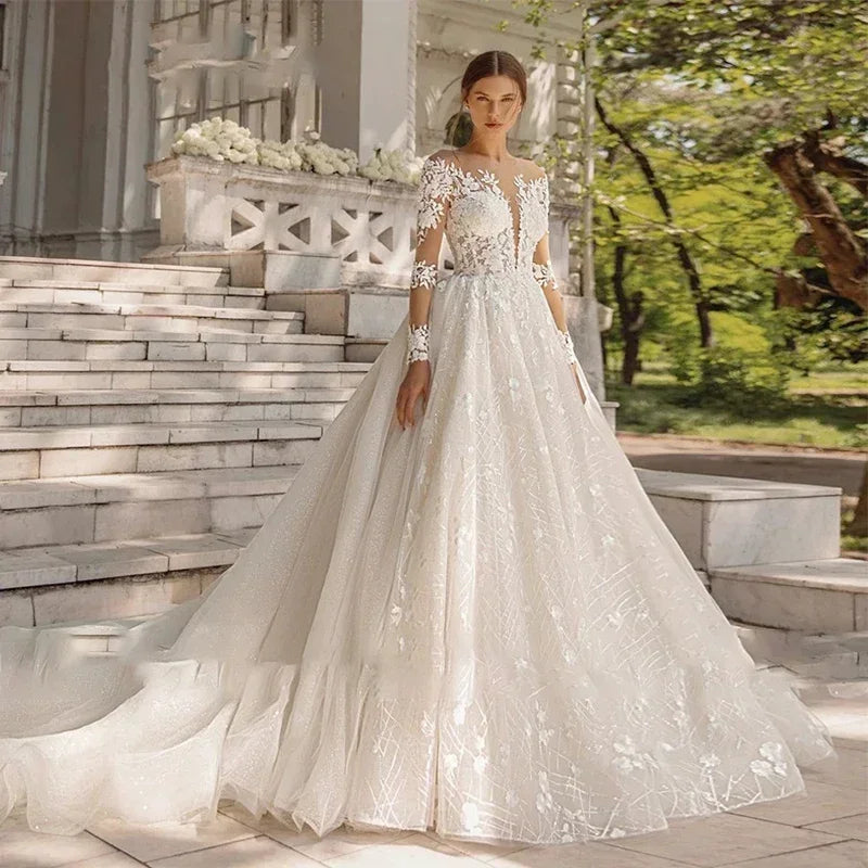 Customzied A-Line Wedding Dress Sparkling Tulle Lace Appliques For Bride Marriage Long sleeve Wedding Gown Vestidos De Novia