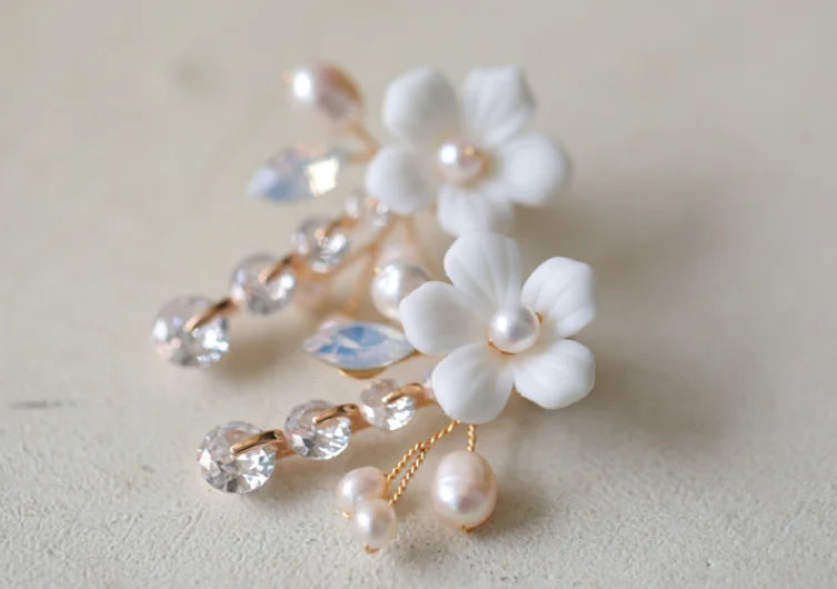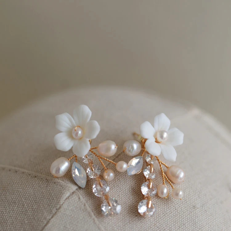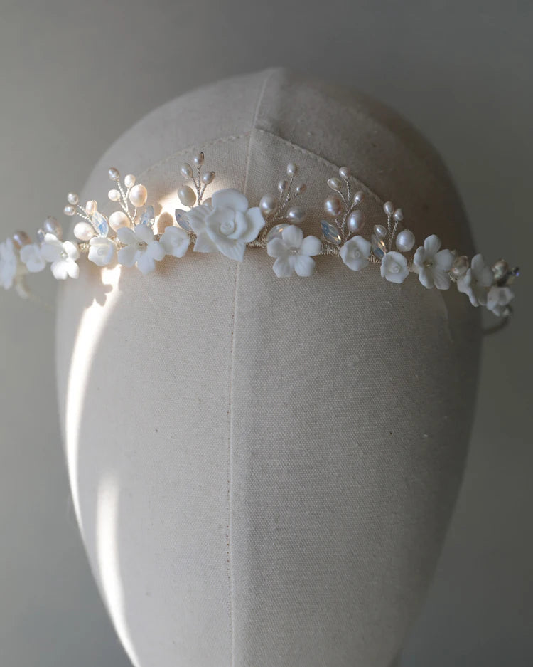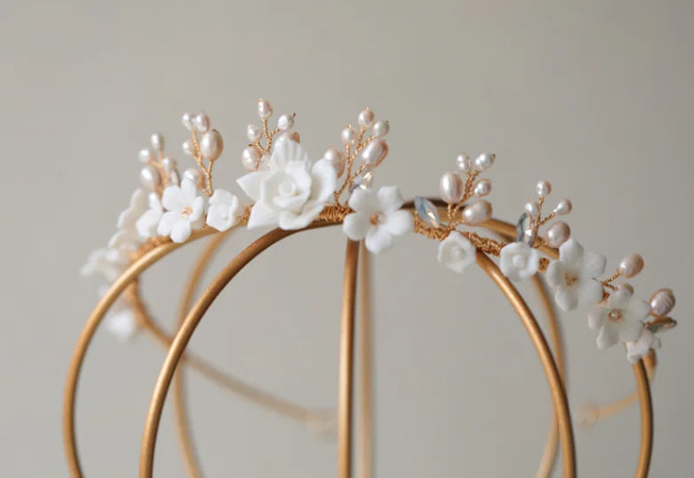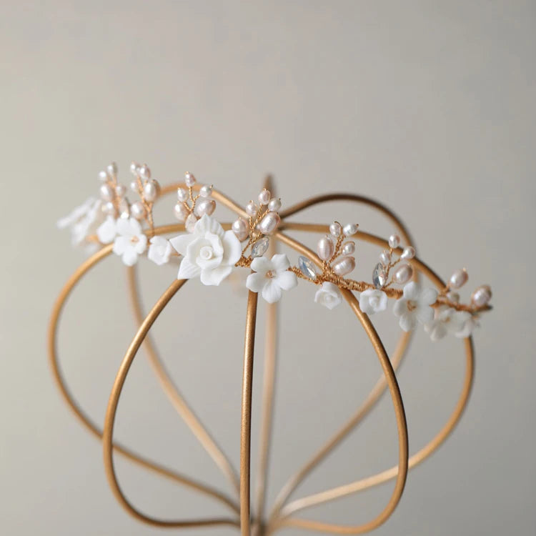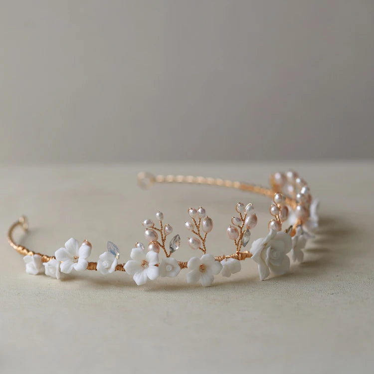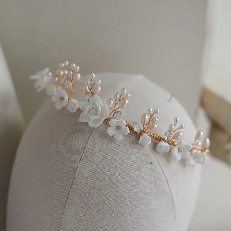 Gold Color Headband Freshwater Pearl Headpiece For Brides Porcelain Flower Hairband Wedding Accessories Bridal Hair Jewelry