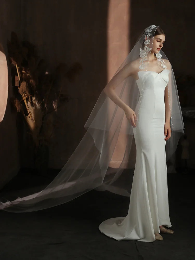 Long Pearl Bridal Veil Flower Lace Wedding Veils For Evening Dinner Party Dress Women Girl Gift Hair Accessories Brides Jewelry