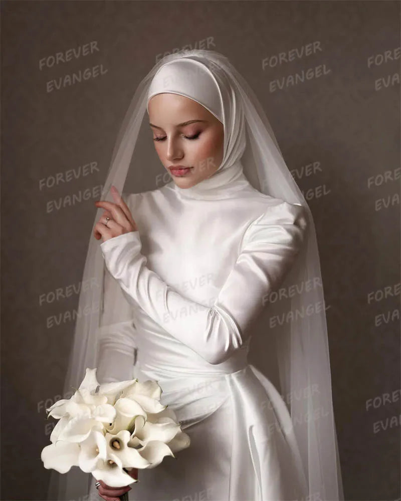 Luxury Muslim Wedding Dresses Mermaid Woman's Long Sleeve High Neck Satin Formal Bride Gowns Elegant Vestido De Novia Customized