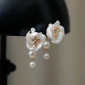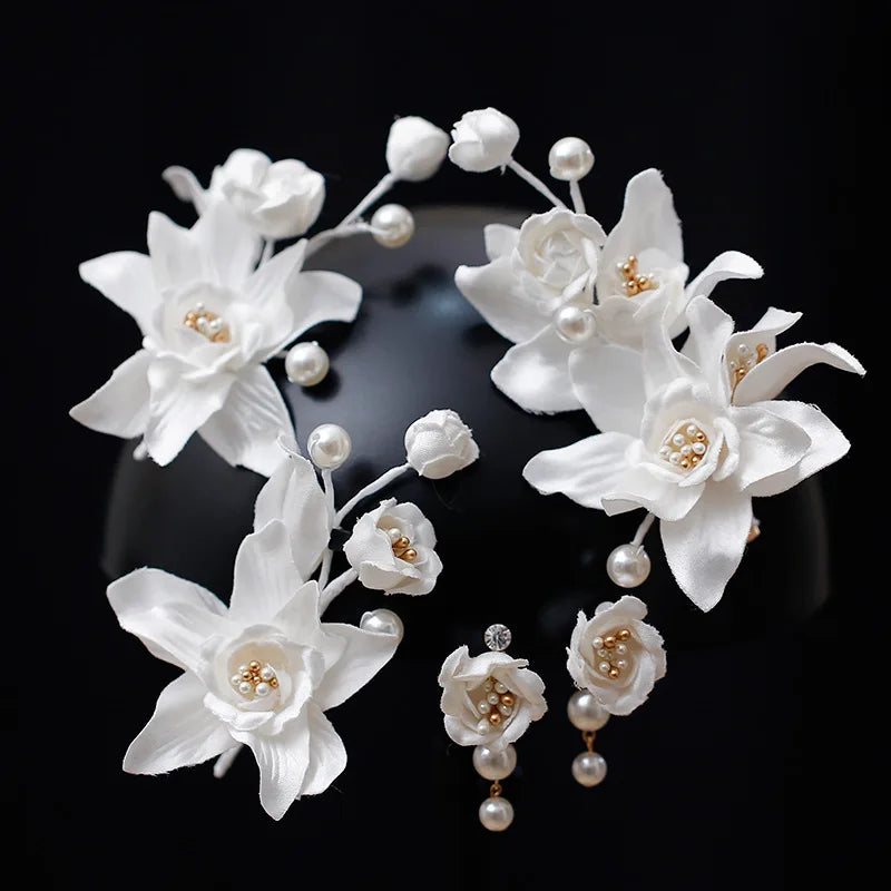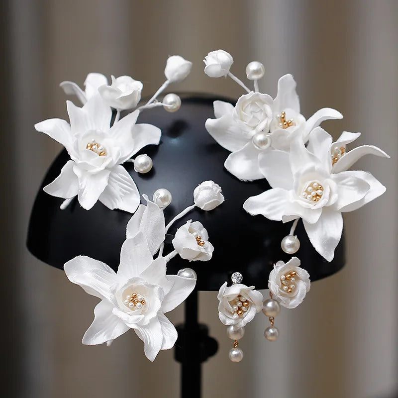 Pearl Head Piece White Flower Floral Hairpins For Brides Women Hair Pins Clips Earrings Set Wedding Accessories Bridal Jewelry