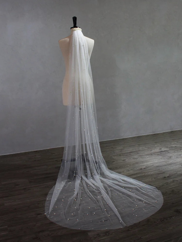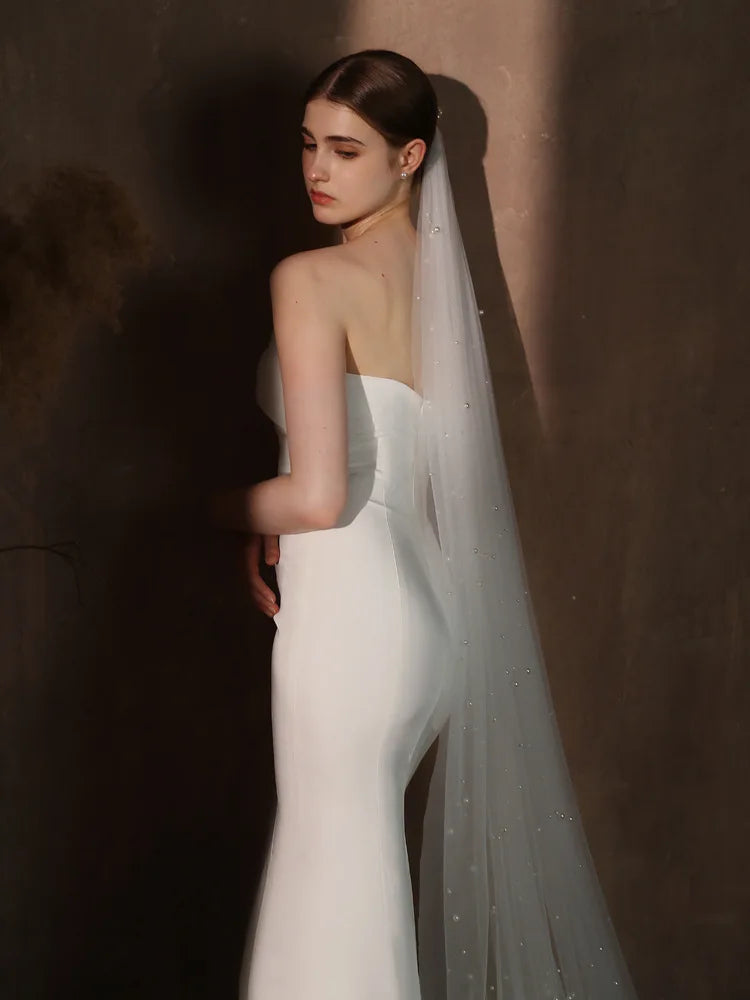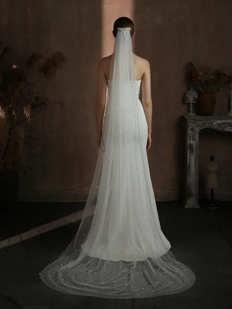 Pearl Long Bridal Veil White Lace Wedding Veils For Evening Dinner Party Dress Women Gift Hair Accessories Brides Jewelry