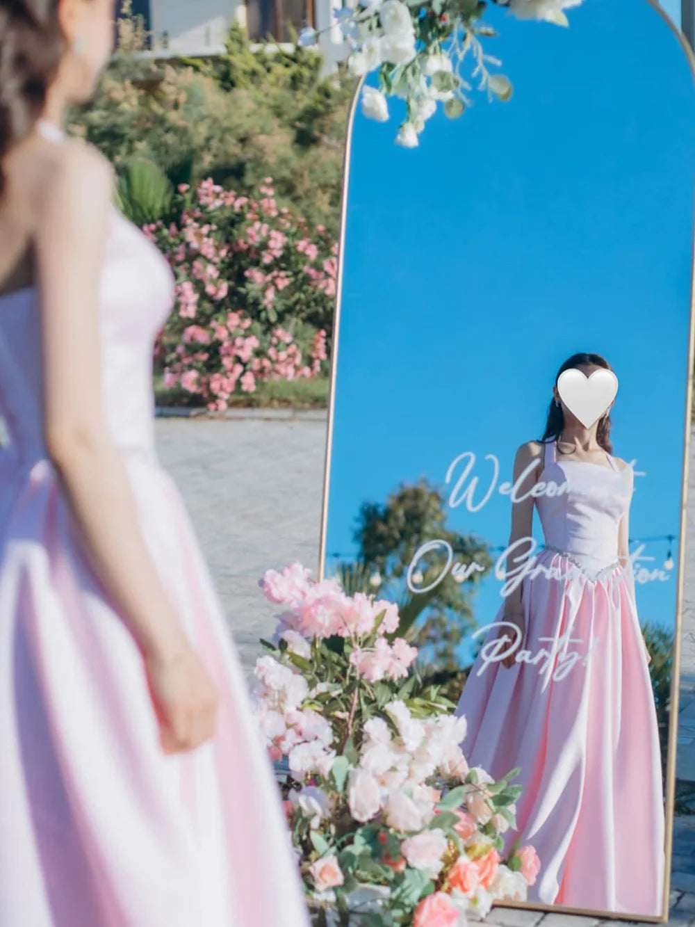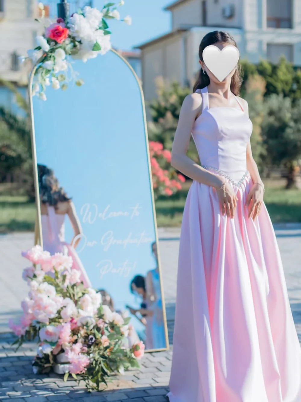 Pink Satin A-Line Evening Dresses Women's Halter Beaded Prom Gown Formal Guest Dress Birthday Party Dress Customized
